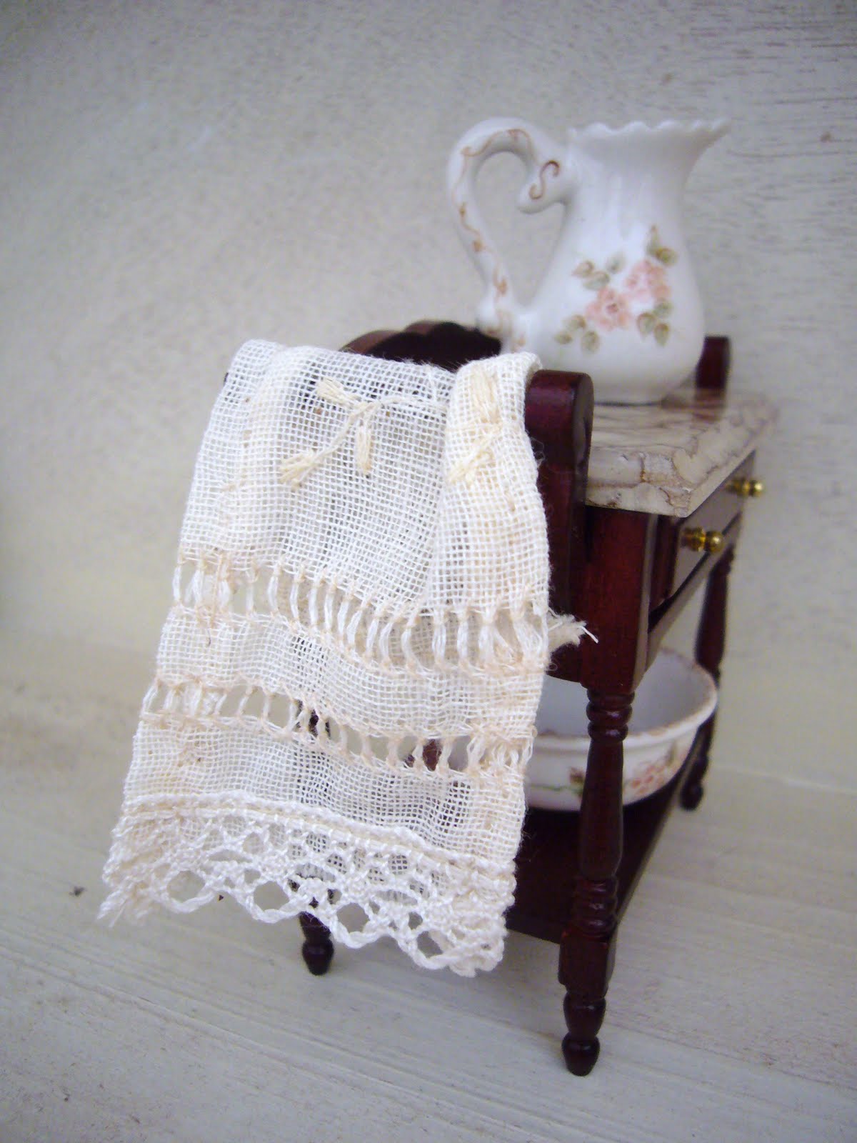 In questi giorni mi sono dedicata alla confezione di questi due asciugamani in lino per la casa Vittoriana: adoro le sfilature e così ho impreziosito i due teli con questo tipo di lavoro, ben felice di attenermi alla tradizione e all'epoca in cui è ambientata la casa. La spugna non esisteva e la biancheria era rigorosamente "bianca", cioè di varie tonalità dall'avorio al crema, dato che nemmeno gli sbiancanti erano stati inventati!